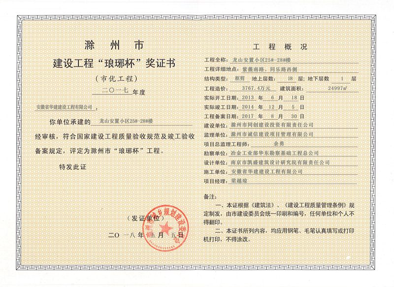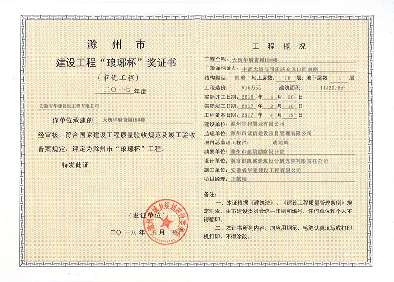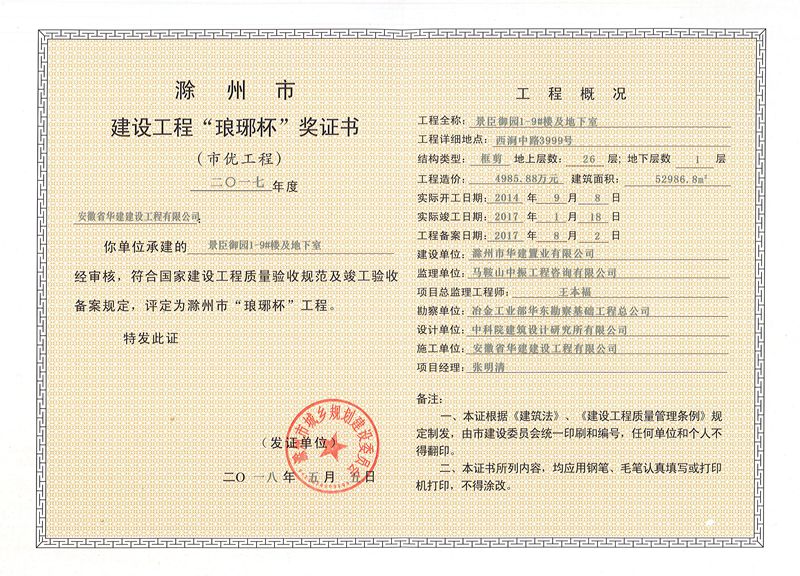 由安徽省華建建設(shè)工程有限公司承建的景臣御園小區(qū)1-9#樓及地下室(建筑面積52986.8㎡)、龍山安置小區(qū)25-28#樓(建筑面積24997㎡)、天逸華府杏園18#樓(建筑面積11420.5㎡)榮獲2017年度“瑯琊杯”市優(yōu)工程獎。