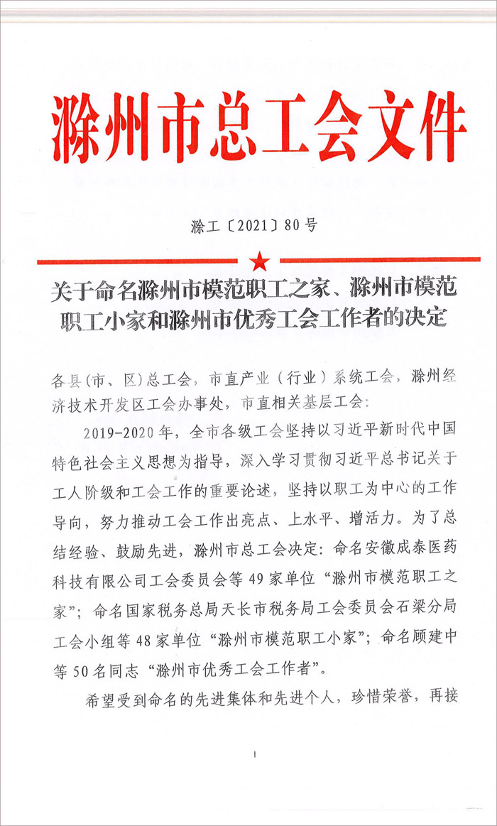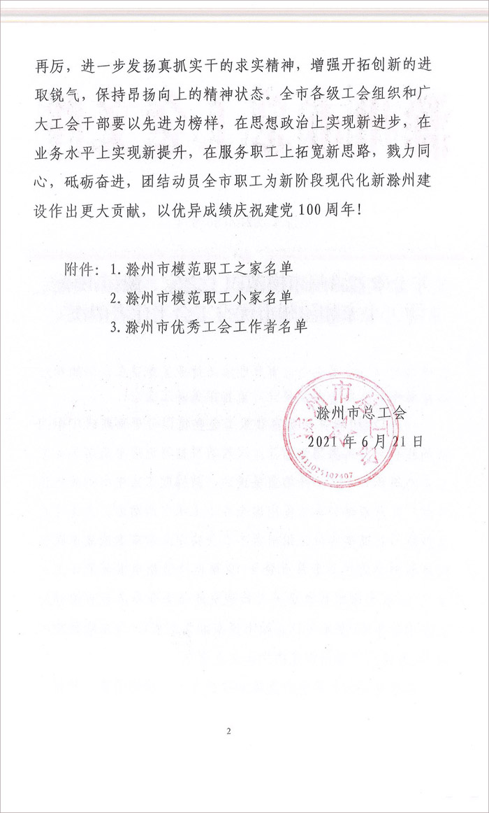 安徽省華建建設(shè)工程有限公司工會委員會堅持以習(xí)近平新時代中國特色社會主義思想為指導(dǎo),深入學(xué)習(xí)貫徹習(xí)近平總書記關(guān)于工人階級和工會工作的重要論述,堅持以職工為中心的工作導(dǎo)向。2021年6月21日受到滁州市總工會表彰,我公司工會承諾會珍惜這份榮譽(yù),并且再接再厲,更好的為職工做好服務(wù)工作。